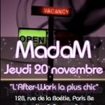 After-Work @ MadaM L'After-Work la plus chic Jeudi 20 Novembre Décalé, sexy et déjanté, découvrez l'Urban-Nights, l'After-Work la plus chic sur les Champs Elysées. Open bar bulles et buffet offerts de 19h à 21h. Après 21h : un cocktail offert et dance floor disco 80's, house... Entrée 15E sur présentation de ce flyer imprimé ou sur mot de passe "Brett and Danny" (sinon 20E). So make it a date & Don't be late ! After-Work dress code. Infos sur www.after-work.fr et www.urban-nights.com Infoline : 06.37.10.25.01 (afterwork@soiree.fr) MadaM 128, rue de la Boétie, Paris 8e métro F. Roosevelt