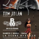 C’est avec toujours autant de sincérité que LouKa revient avec l’album « Des singes en automne » à paraître le 4 mars. LouKa aujourd’hui renoue avec ses premières amours : un rock dur aux guitares saturées, un rock sans fioritures associé à des textes toujours autant inspirés par cette foutue nature humaine. Tom Jolan et son groupe, cest un univers musical qui mêle une énergie explosive armée de gros riff rock progressif, à des mélodies plus douces aux sonorités Blues et Pop, sur des textes écrits en anglais. Broken Wings est né de la volonté de garder une énergie Rock, mais en donnant une attention toute particulière aux mélodies. Leur style se situe quelque-part entre Post-Grunge et Pop-Rock : une voix claire est portée par une instrumentation dynamique.