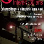 LIEU : LE SENS – PARIS 8 Ce jeudi de 19h00 à 01h00 Coupes et Buffet OFFERTS jusqu’à 21h00 21h00/ 01h : une coupe OFFERTE ***Le + : groupes d’amis & sociétés peuvent bénéficier d’avantages !*** Venez passer un moment convivial au sein de l’After work interdit moins de 30 ans au Sens. Nous vous proposons cet after work de manière à vous garantir un cadre de soirée spécialement pour vous ! Vous pourrez discuter, danser, rencontrer de nouvelles personnes ! Alors rendez-vous ce jeudi dés 19h00 pour déguster un savoureux cocktail dinatoire au rythme de vos tubes préférés ! Ambiance garantie ! Tarifs : *De 19h à 21h00 : Entrée 15€ (avec Pass sinon 20€) Coupes et buffet OFFERTS ! *Après 21h00 : Entrée 15€ (avec une coupe) *Pack Bouteille 150€ : 4 Entrées + Table et bouteille au choix Particuliers et entreprises bénéficiez d’avantages ! Coupe-file, soirées anniversaires, comité d’entreprise. Pour plus d’informations : contact@unesoireeprivee.com / 06.16.06.08.80 Le Sens 23 rue de Ponthieu 75008 Paris Réservez dés maintenant votre place sur www.resasoiree.com. (Aucune attente, entrée prioritaire, vous garantie de pouvoir rentrer, etc.)