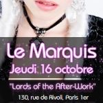 After-Work @ Le Marquis Lords of the After-Work Jeudi 16 Octobre Après un an de travaux, Le Marquis rouvre ses caveaux et alcoves réservés à l'aristocratie des After-Works. Open bar bulles et buffet offerts de 19h à 21h. Après 21h : un cocktail offert et dance floor disco, généraliste, house... Entrée 15E sur présentation de ce flyer imprimé ou sur mot de passe "Brett and Danny" (sinon 20E). So make it a date & Don't be late ! After-Work dress code. Infos sur www.after-work.fr et www.urban-nights.com Infoline : 06.37.10.25.01 (afterwork@soiree.fr) Le Marquis 130, rue de Rivoli, Paris 1er métro Louvre Rivoli